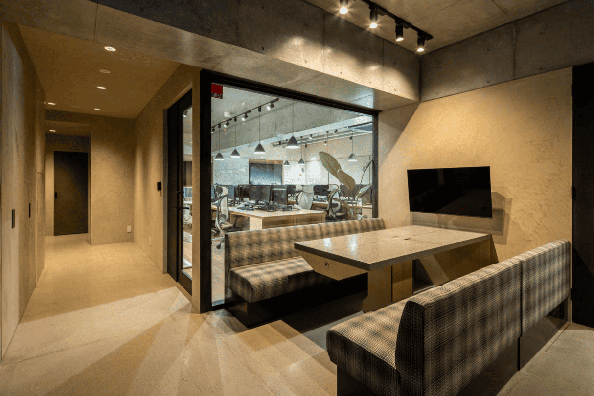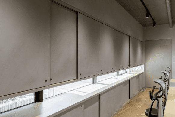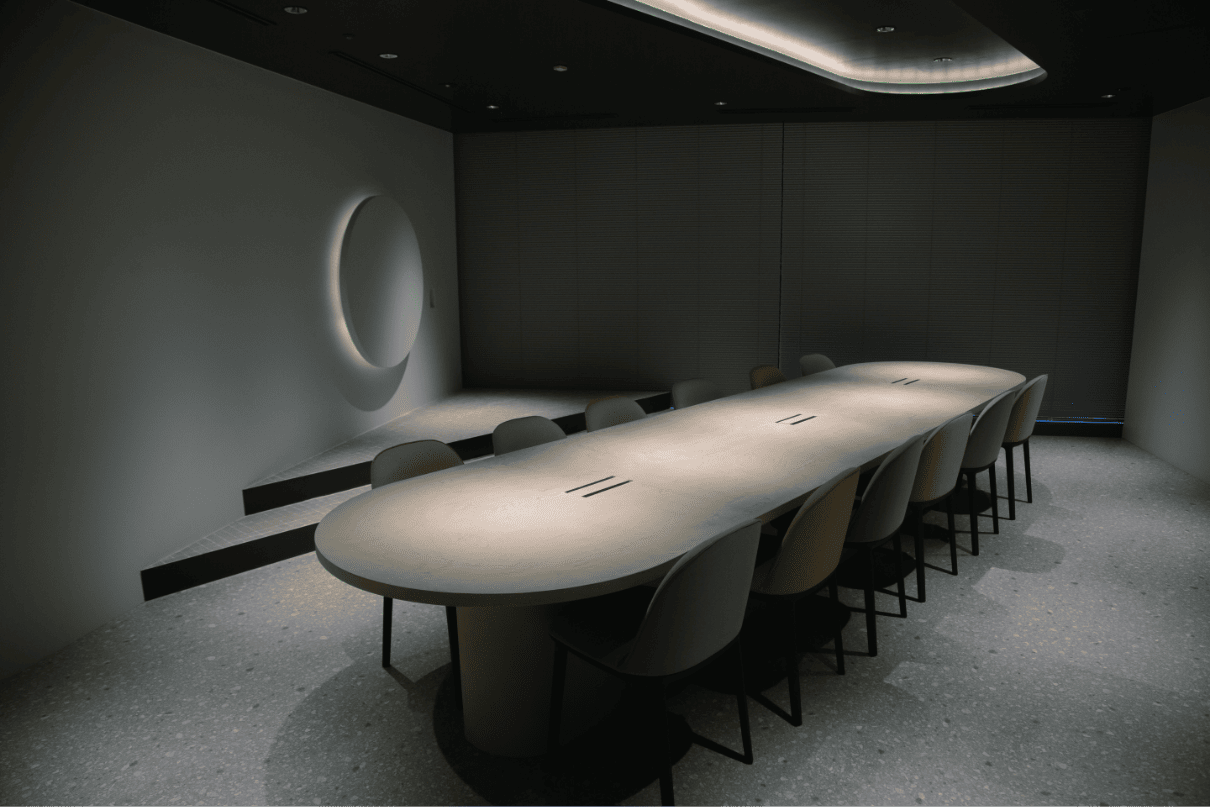 手仕事の味わいを感じさせる温かみのあるベージュトーンの左官仕上げが、無機質になりがちなオフィス環境に柔らかな奥行きと品格を与えています。