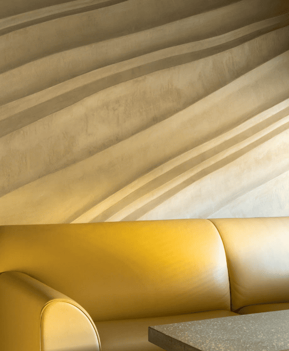 壁と天井に施されたアンティーク・モルタルは、無数のダウンライトの光を優しく受け止め、空間全体に拡散させます。職人技術によって微細な凹凸が施された壁が光に複雑な表情を与え、光そのものを室内のデザインとして溶け込ませています。