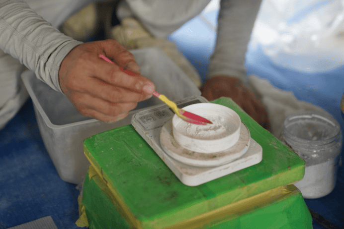 - 磨き均しからおよそ12時間乾燥させた後、ハンドグラインダーで磨いてつや出しをします。