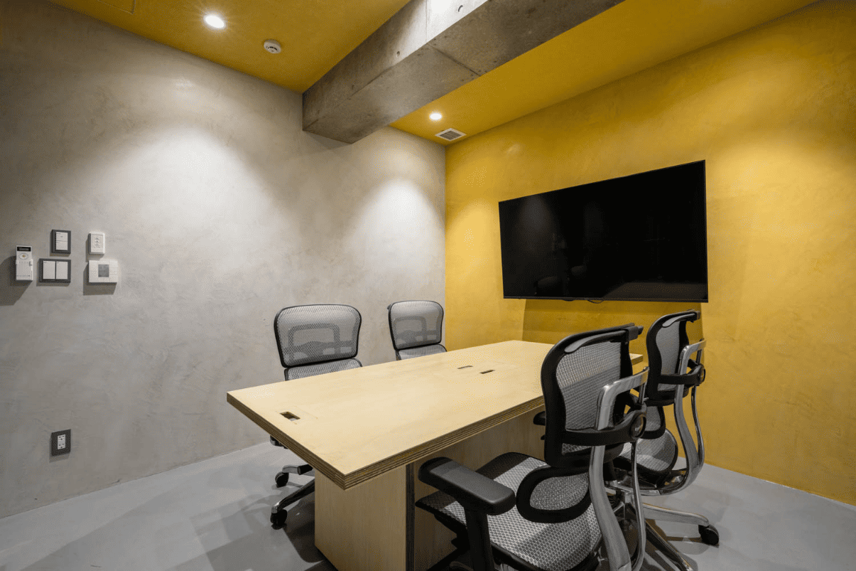 空間に力強い印象を与えているのは、イエローとグレーの2色で構成された内装仕上げの壁です。量産品のクロスでは決して表現できない絶妙な色彩表現とテクスチャーによる陰影が、無機質になりがちなオフィス空間に心地よいゆらぎをもたらしています。