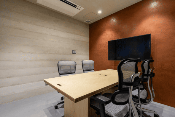 手仕事の味わいを感じさせる温かみのあるベージュトーンの左官仕上げが、無機質になりがちなオフィス環境に柔らかな奥行きと品格を与えています。