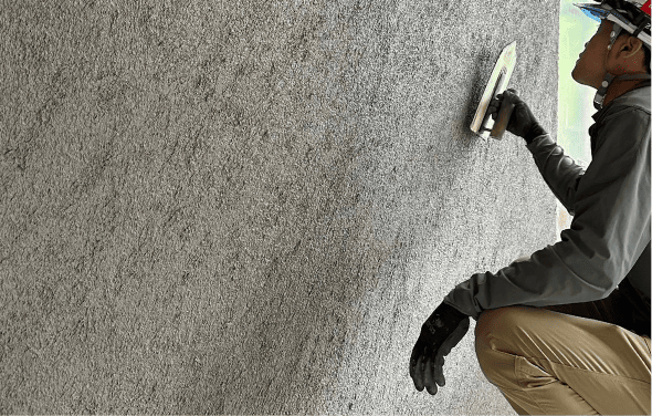 モルタル調左官材としては高い耐久性をもち、乾燥や収縮に強いためひび割れも起きにくく、JISで認定されている高強度コンクリートの圧縮強度45N以上の強度をもつ、高強度な左官材という特徴を持ちます。そのため外壁などにも利用できます。