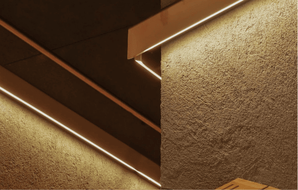 壁と天井に施されたアンティーク・モルタルは、無数のダウンライトの光を優しく受け止め、空間全体に拡散させます。職人技術によって微細な凹凸が施された壁が光に複雑な表情を与え、光そのものを室内のデザインとして溶け込ませています。