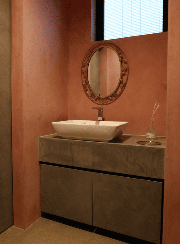 防水剤を調合することで、湿気や水濡れが避けられない場所においても防水性を維持し、その美しさを発揮します。そのため、空間の統一感を損なうことなく、あらゆるシーンでの採用が可能です。屋外のベンチからリビング、洗面スペース、さらにはバスルームまで、同一の素材感で繋げることが可能になります。また、「屋外のベンチを室内の壁と同じ質感で作りたい」といったご要望にも柔軟に対応可能です。