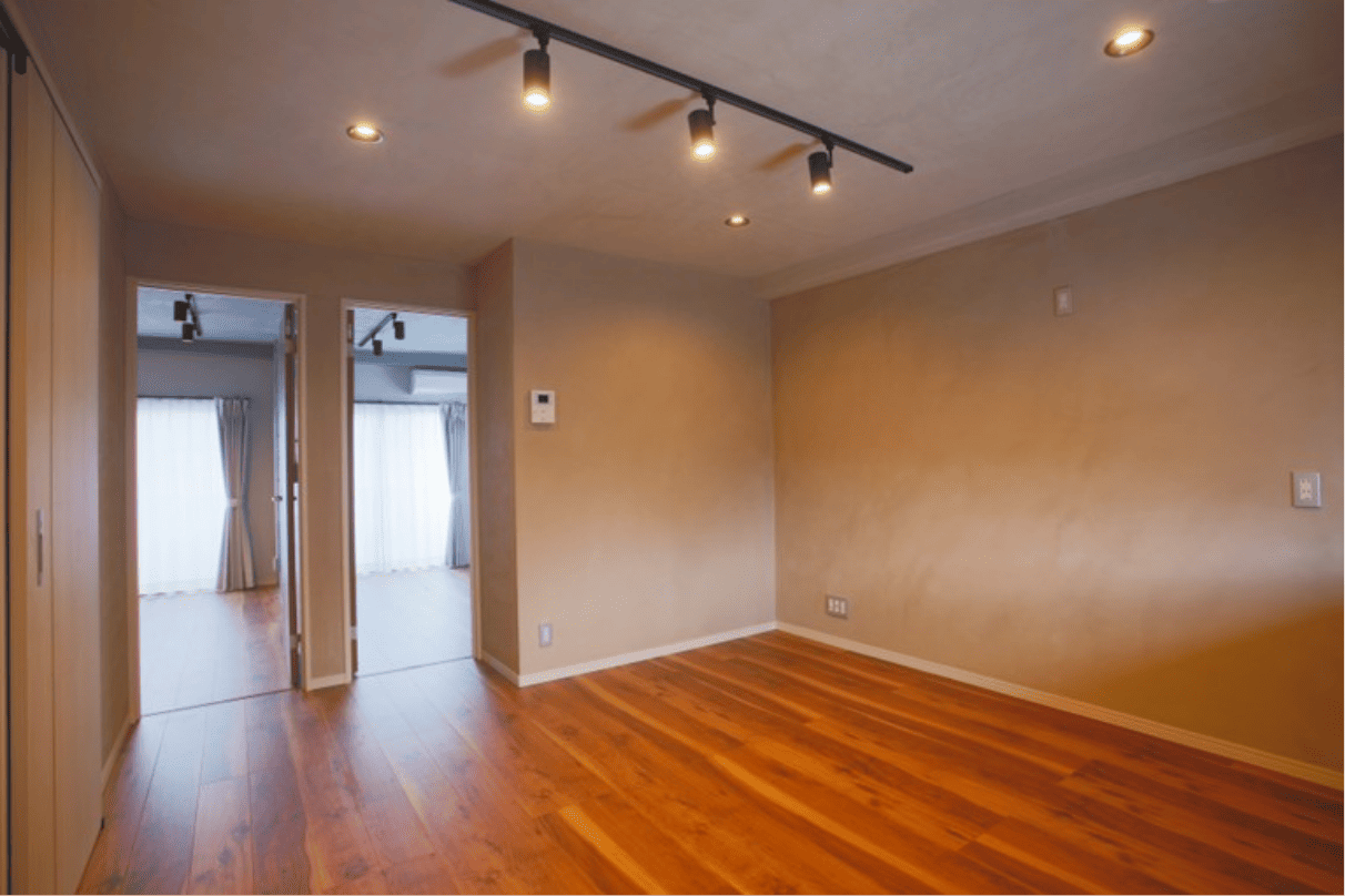 床にタイルやフローリングのような「目地」がないため、視線が遮られることなく、実面積以上の広がりを感じさせます。白を基調としたミニマルなインテリアと特有のエイジング感が、無機質になりすぎない空間をつくりだします。